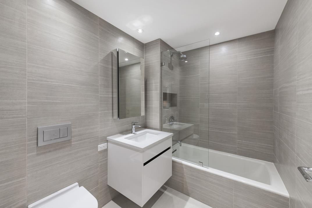 The over-sized corner bedroom facing south and west has floor to ceiling windows and overlooks a community garden. The bathroom features a floating vanity, quartz counter-tops, Grohe fixtures, a glass-enclosed deep soaking tub and shower, floor and wall tiles and a wall-hung Toto toilet.