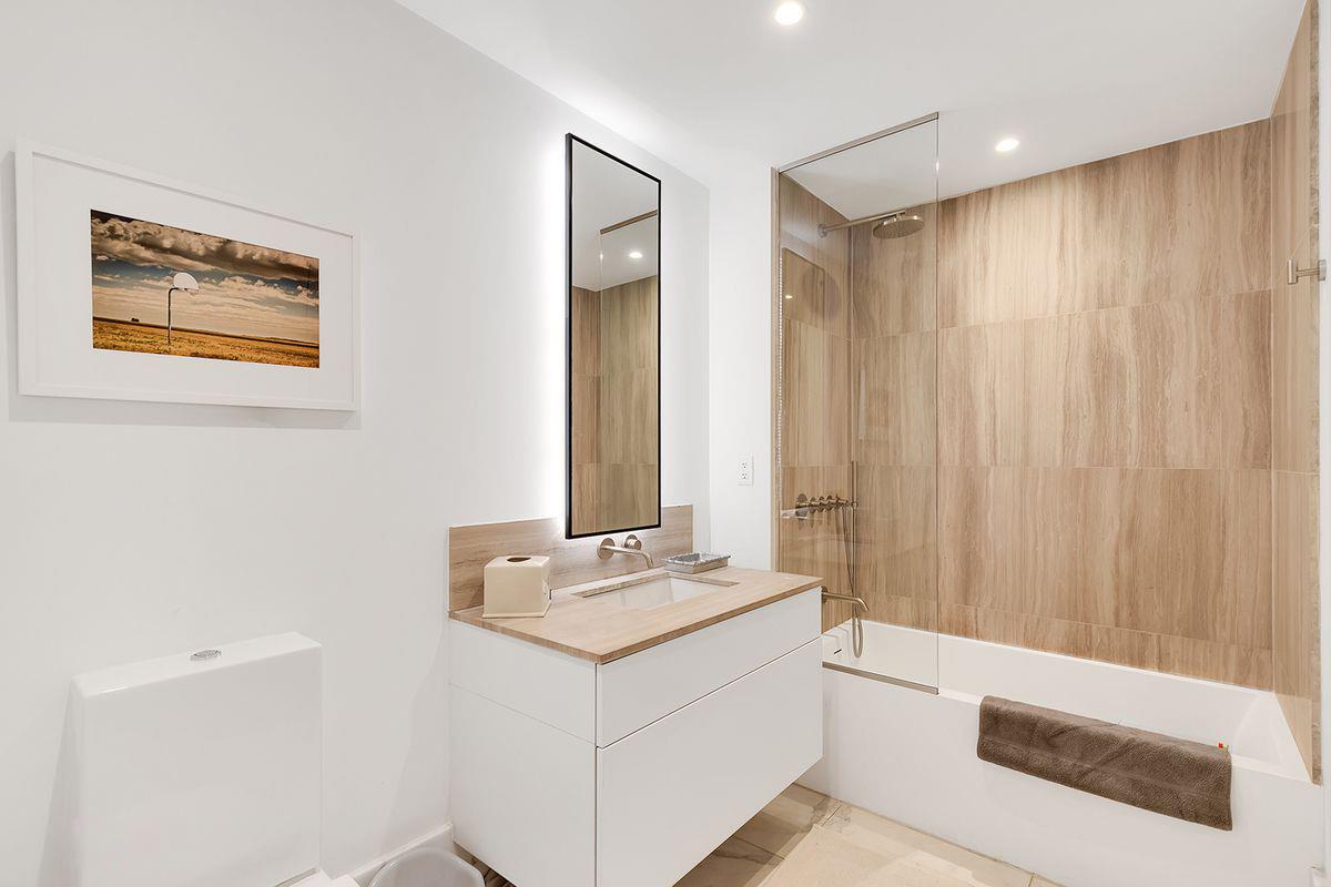 The home features abundant built-in storage and en-suite bathrooms, custom millwork, wide plank wood floors, Smeg appliances, washer/dryer, and beautiful natural stone details throughout. The high floor east facing residence offers great light with floor to ceiling windows.