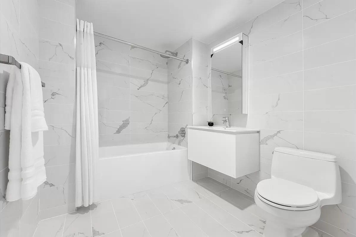 The bathroom features Calacatta porcelain, a Duravit white gloss vanity, a mirrored medicine cabinet, a deep soaking tub with Grohe fixtures and Moen accessories.